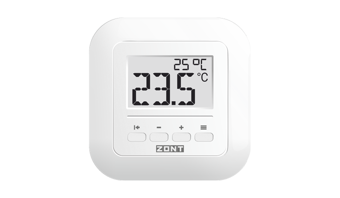 Комнатный термостат ZONT МЛ-332 предназначен для контроля температуры воздуха в отдельной зоне обогрева с отображением текущего и целевого значения температуры на дисплее. Ввод целевого значения температуры осуществляется вручную через термостат или дистанционно из сервиса ZONT. Для измерения температуры используется встроенный датчик воздуха NTC-10.