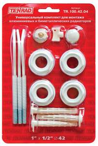 Комплект предназначен для монтажа алюминиевых и биметаллических радиаторов с присоединительным размером верхнего и нижнего коллекторов 1" (внутренняя резьба). В состав комплекта включены четыре футорки – две правые и две левые. Футорки снабжены силиконовыми прокладками. Также в комплект включены пробка для футорки, ручной самоуплотняющийся воздухоотводчик, ключ для воздухоотводчика, кронштейны и дюбели для крепления радиатора к стене. Кронштейны, как и футорки выполнены из оцинкованной стали, окрашены белой эпоксидной эмалью. Элементы комплекта рассчитаны на рабочее давление до 16 бар. В качестве теплоносителя в системе может применяться как вода, так и незамерзающая жидкость.
