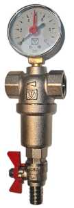 (VT.389.N) Компактный фильтр механической очистки воды с возможностью удаления накопившихся загрязнений без извлечения сетчатых вставок (промывной фильтр). Оснащен двумя (один в другом) фильтроэлементами из нержавеющей стали. Размер ячеек сетки первичного фильтроэлемента – 1000, вторичного – 250 мкм. Корпус и колба фильтра выполнены из латуни марки CW617N (европейский стандарт EN 12165), никелированы. Предусмотрены дренажный шаровой кран со штуцером для подключения шланга и манометр для контроля уровня загрязненности сеток. Фильтр монтируется в вертикальном положении, колбой вниз. Резьба присоединений – внутренняя.