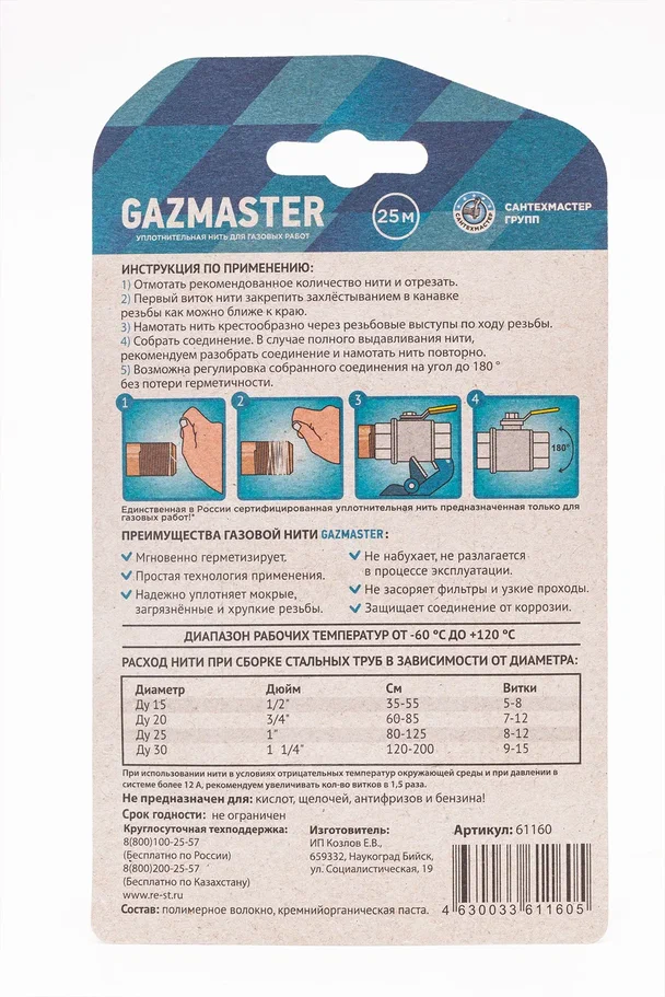 НИТЬ д/герм. резьб. соед. GAZMASTER бокс, блистер 25м /61160/ купить в Кургане - 193 ₽