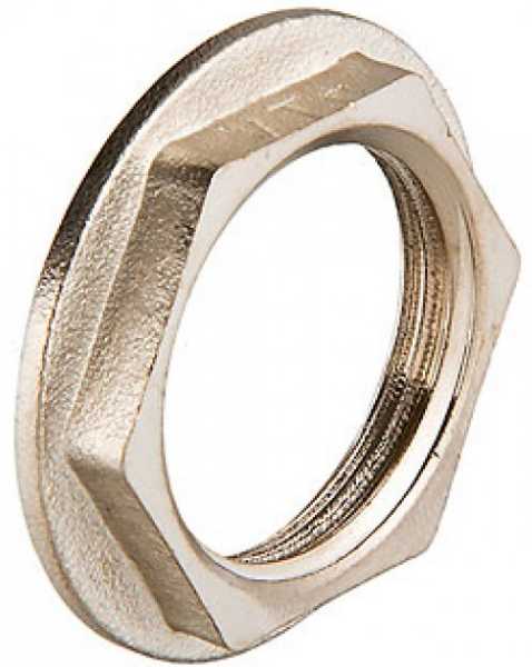(VTr.655.N) Контргайка – простой и эффективный вид гаечных замков, предназначенных для недопущения самопроизвольного раскручивания элементов резьбовых соединений (муфт, сгонов, пр.) при вибрации, гидравлических ударах. Реборда, выступающая за шестигранную часть гайки, увеличивает надежность фиксации, повышает герметичность, улучшает внешний вид соединения (скрывает волокна уплотнителя). Как и другие резьбовые фитинги VALTEC, контргайка с ребордой выполнена методом горячего штампования из латуни CW617N с последующим никелированием, имеет трубную цилиндрическую резьбу, совместимую с конической.